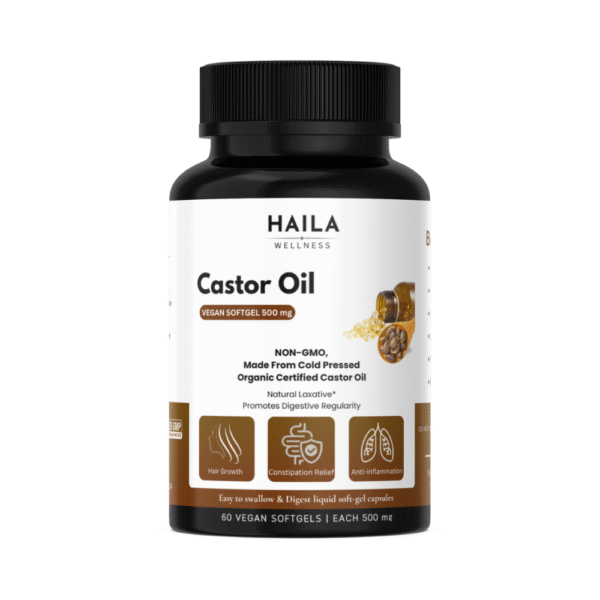 These Castor Oil Softgels from Haila Wellness provide the familiar benefits of castor oil in a clean, mess-free softgel capsule. Formulated for convenience, the softgel format ensures consistent dosing and simple daily use—no measuring or topical application required. Castor oil’s nourishing profile makes it a versatile addition to wellness-focused supplement routines.